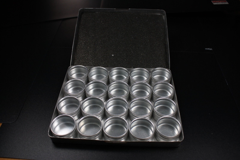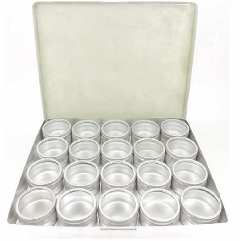 Fabricada en aluminio. 20 cajitas pequeñas con tapa transparente.