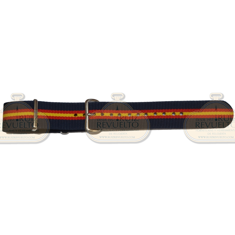 Correa de tela nailon que consta de una sola pieza y se sujeta al reloj con un doble lazo bajo la caja y los pasadores, asegurando que no se suelte y por tanto una mayor durabilidad.