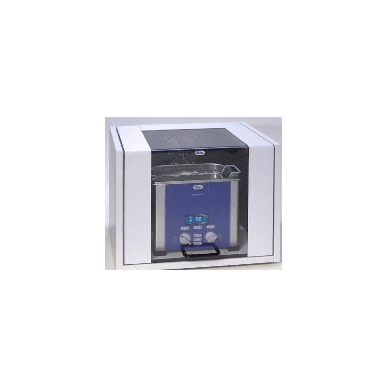 Caja de protección sonora para aparatos de limpieza por ultrasonidos. Gracias a la intensa reducción de la emisión de ruidos es posible utilizar el aparato de limpieza por ultrasonidos directamente en puestos de trabajo sensibles. Se aspiran los vapores generados para que no se acumule calor o humedad en el interior de la caja.